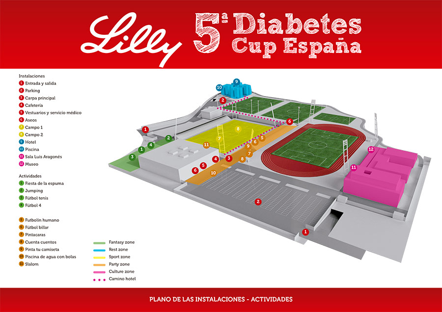 Cerca de los campos de fútbol donde se celebrarán los partidos, se encuentra la zona de juegos y actividades para todos. Además dispondremos de: Zona especial diabetes. Zona Sanitaria. Zona de Medios y Zona de Patrocinadores.